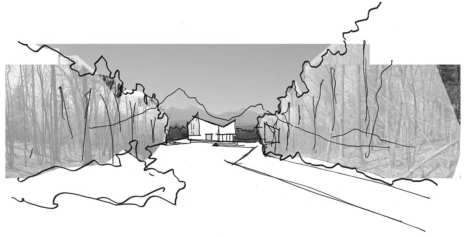 The site is characterized by narrow paths that open up to expansive views of the mountains beyond. The building is located at the site’s highest point with a narrow pathway leading up to it. At the end of this pathway, an opening in the trees affords views to the mountains beyond to both the northwest and southeast. The building occupies the opening and mimics the geometry of the mountains beyond conceptually completing its profile. Its horseshoe-shaped plan embraces the rocky earth, and internally frames the extensive mountain views.