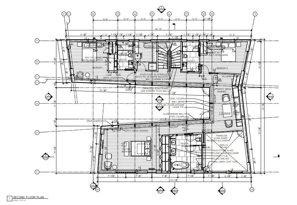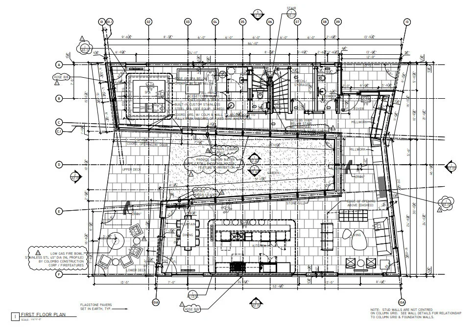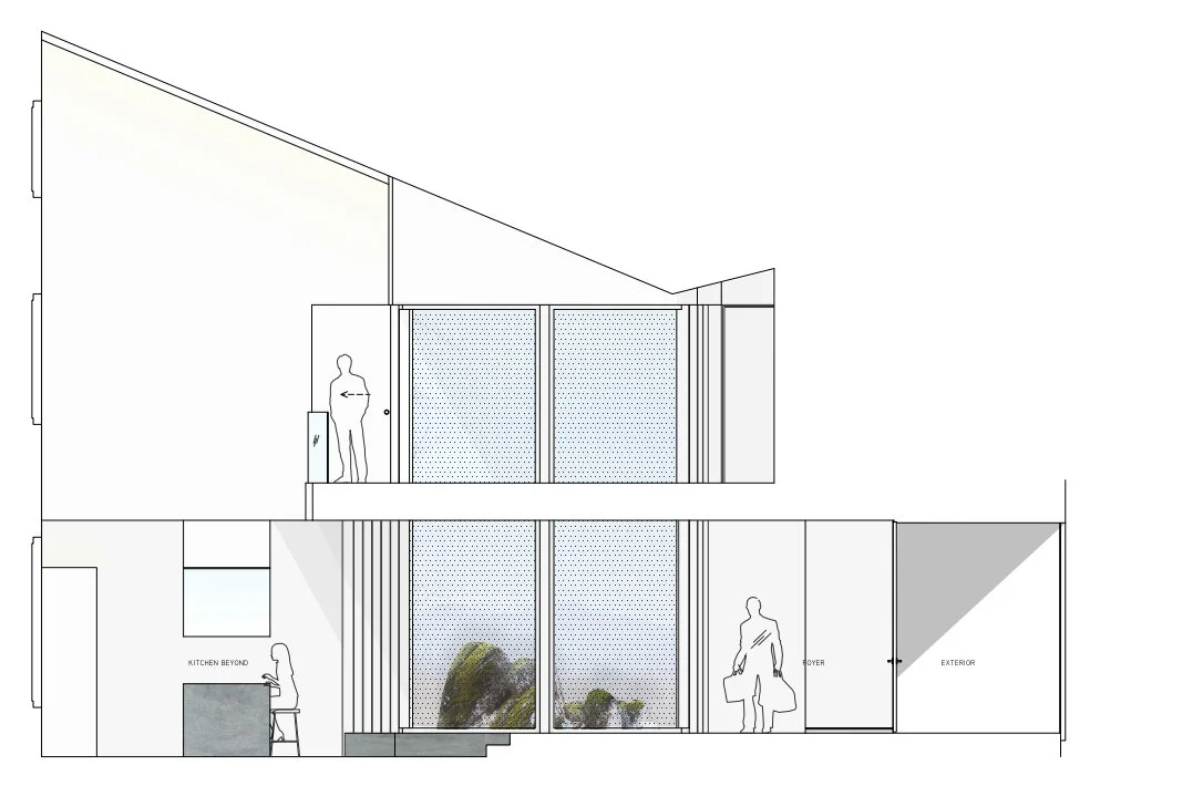 The courtyard sits at the center of the house surrounded by a wall of glass. Heating & cooling is delivered though custom water-jet cut stone vents that match seamlessly with the floor stone.