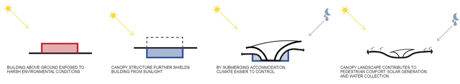 While society has largely become acclimated to the idea of solar power and photovoltaic technology, we find the water capture strategy to be remarkable, relatively unexplored and, even to a certain degree, fantastical. The systems being developed have not been applied previously on such a large scale. It is both its striking form and unusual capabilities that make the Sustainability Pavilion unique as a functional laboratory for architectural exploration, demonstrating the possibilities of sustainable design even in challenging climates.